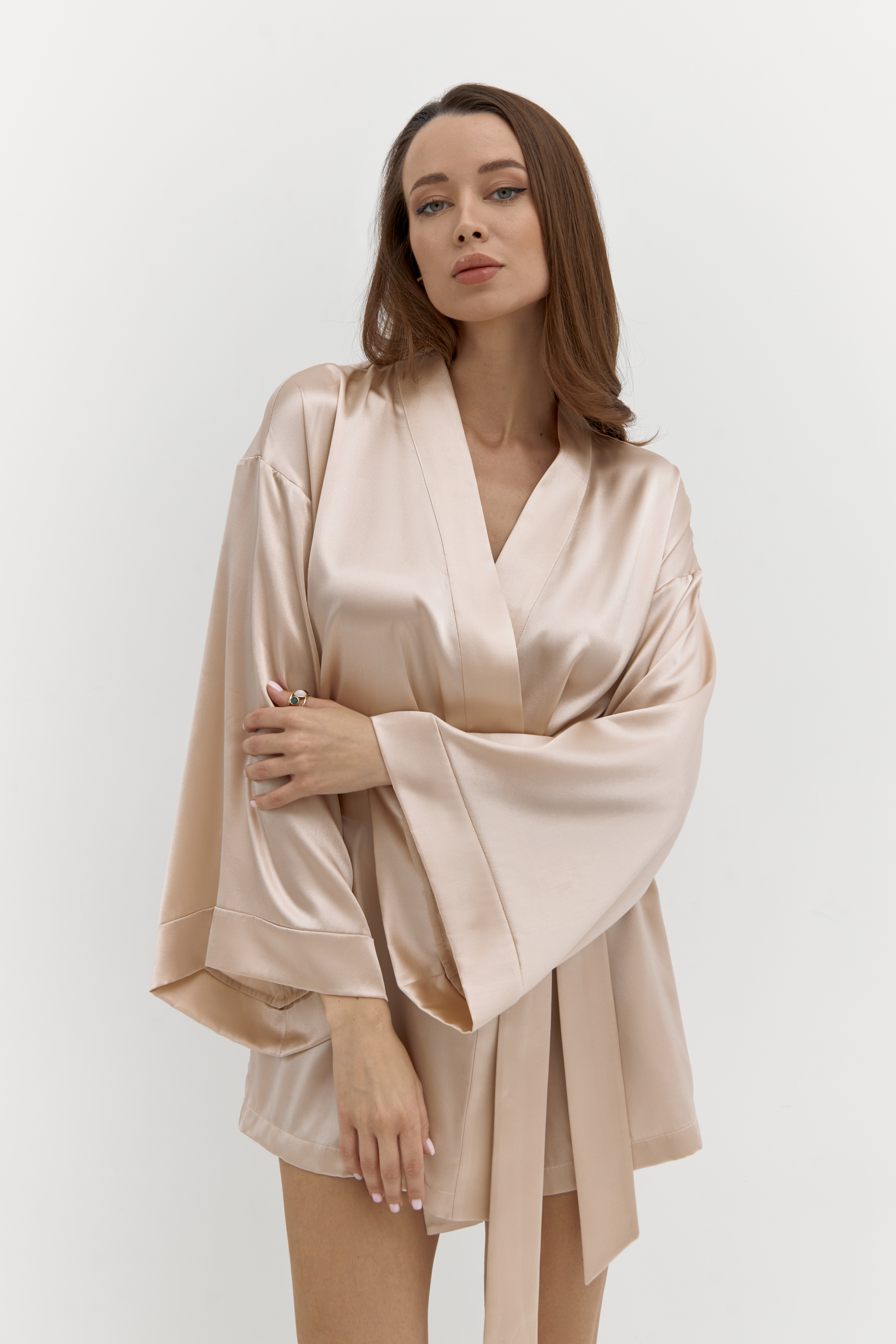 Короткий халат Kelly изготовлен из мягкого натурального шёлка с небольшим добавлением эластана, обеспечивающим удобство и комфорт. Идеальный выбор для создания уютного домашнего образа.